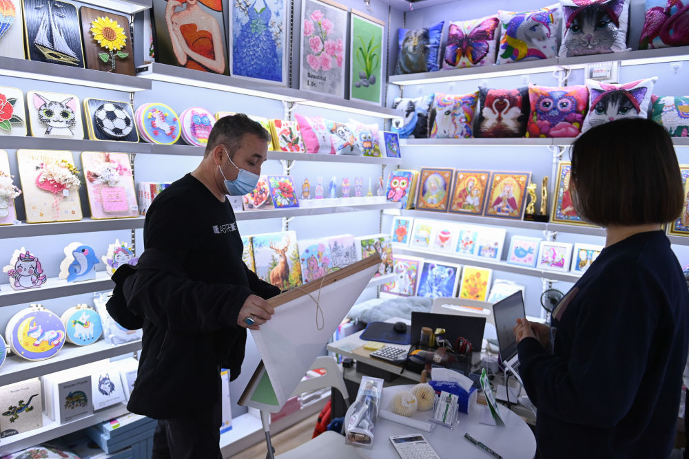 外国客商(左)在义乌国际商贸城的商铺内选购装饰品(2022年11月17日摄)黄宗治摄/本刊