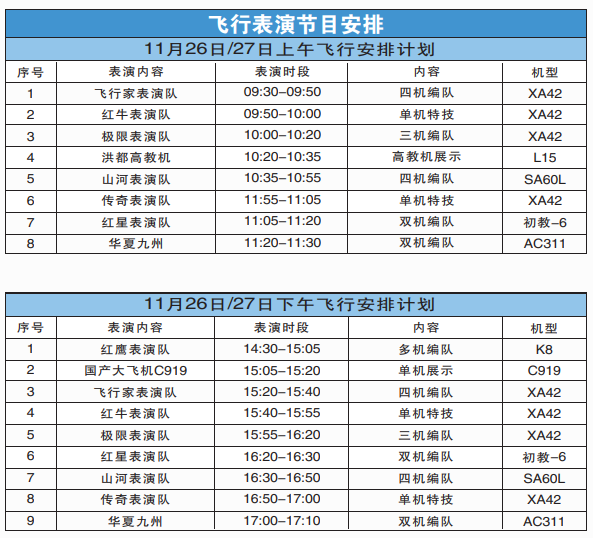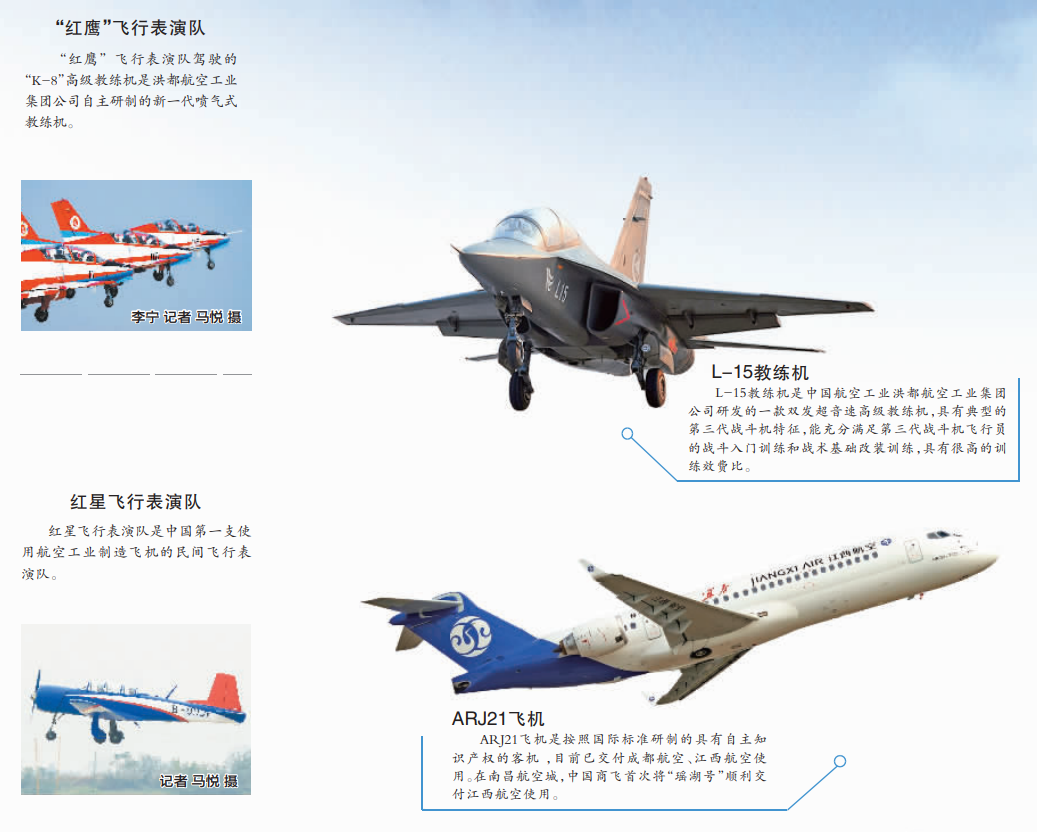 “红鹰”飞行表演队由空军航空大学2011年8月成立组建,是我国空军三大飞行表演队之一,其飞行员主要是中国人民解放军空军航空大学的教官,在深化飞行教学、助力飞行学员成长上发挥重要作用。值得一提的是,飞行员驾驶的“K-8”高级教练机是洪都航空工业集团公司自主研制的新一代喷气式教练机。红星飞行表演队是中国第一支使用航空工业制造飞机的民间飞行表演队;中国第一支初教-6飞机民间飞行表演队;中国第一支全部由退役空军资深飞行教官组成的飞行表演队,人均空中飞行教学5000小时以上,有着精湛的飞行技术和高超的飞行表演水平。
