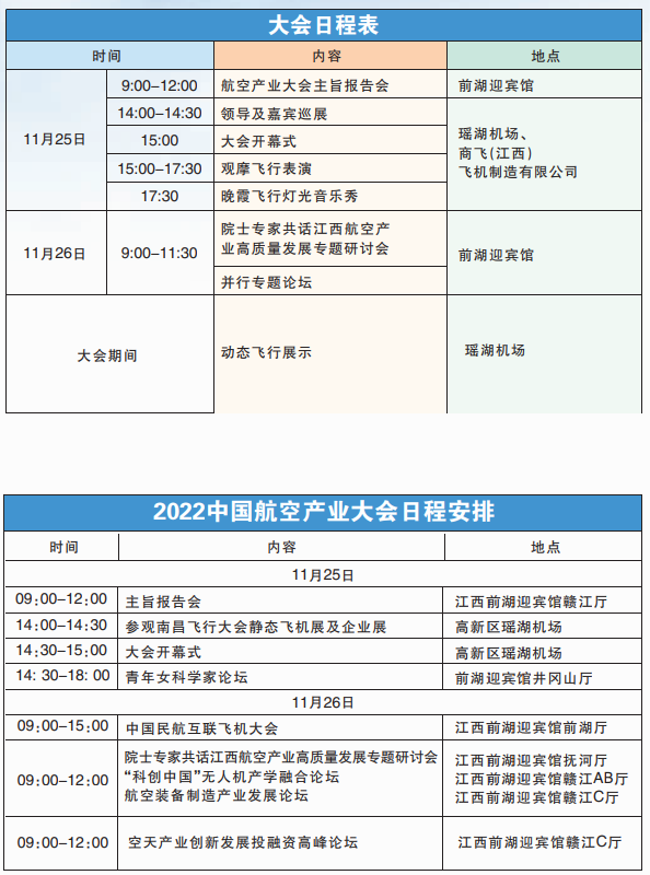本届航空产业大会突出航空装备制造主题,将学术研讨与产业招商相结合,除主旨报告会外,还将举行院士专家共话江西航空产业高质量发展专题研讨会和6场专题论坛。专题论坛聚焦航空产业风向将开展“中国民航互联飞机大会”“‘科创中国’无人机产学融合论坛”“航空装备制造产业发展论坛”“空天产业创新发展投融资高峰论坛”“海外招才引智交流会”“青年女科学家论坛”等。
