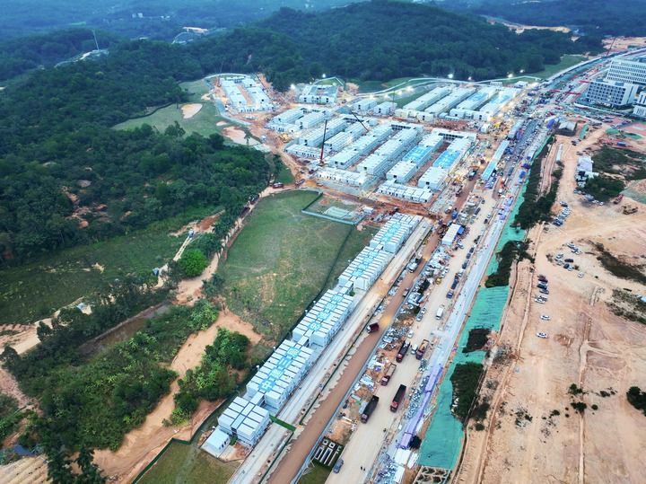 在广州黄埔区中新知识城方舱医院工地上,中国建筑第四工程局有限公司的施工团队以小时为单位倒排工期,逾千名建设者轮班倒,机器连轴转,24小时不间断施工。经过9天9夜连续奋战,这座方舱医院于11月22日晚交付,可提供数千张床位。