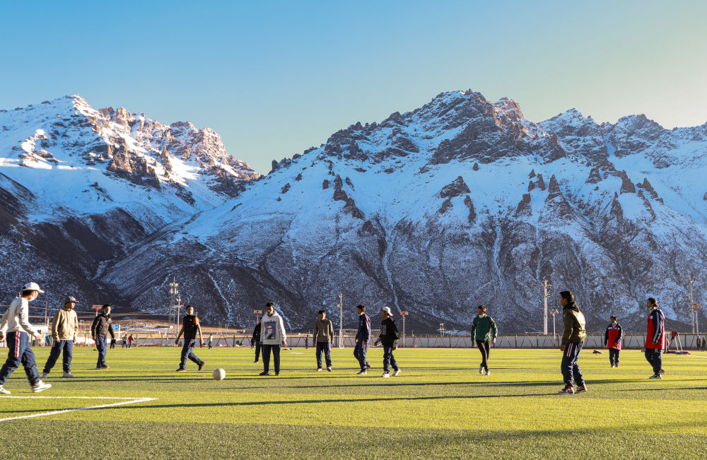 西藏当雄县中学的学生们在踢足球(1月5日摄)。新华社发(索朗珠扎 摄)