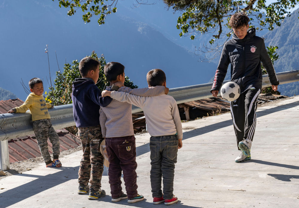 在西藏林芝市墨脱县德兴乡巴登则村,旺前罗布向弟弟们展示自己的球技(2021年2月9日摄)。新华社记者 孙非 摄