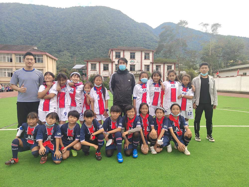 西藏那曲市第五届U15校园足球联赛冠军后,嘉黎县中学的孩子们和足球老师向巴宗卓(左一)在操场上合影留念(4月30日摄)。新华社发(拉巴次仁 摄)