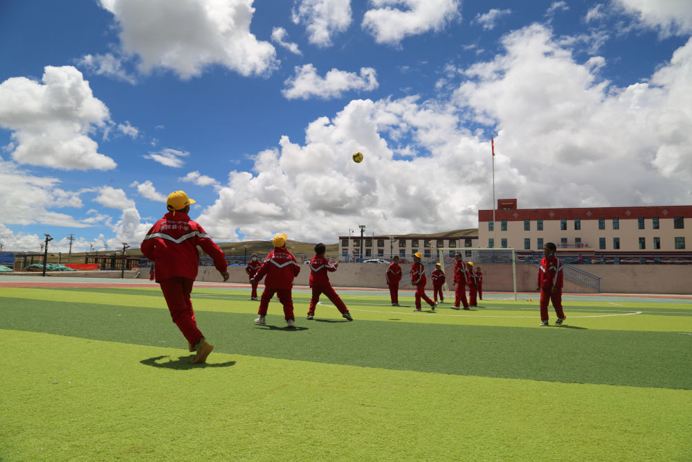 西藏那曲市聂荣县小学的学生们在踢足球(4月20日摄)。新华社发(大巴次 摄)