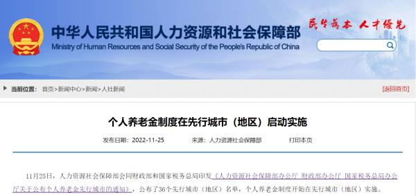 11月25日,人社部会同财政部、国家税务总局印发了《关于公布个人养老金先行城市的通知》(以下简称《通知》),公布了36个先行城市(地区)名单,个人养老金制度开始在先行城市(地区)实施。