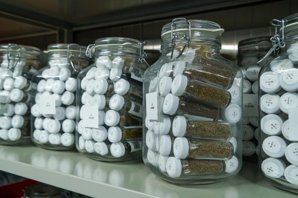 打开厚重的铁门,走进资源库的干燥间,一个个中药种子密封储存瓶整整齐齐摆放着,标签上注明了种子的名称、药效等。分装好的中药种子正在恒温恒湿的环境里慢慢脱水。