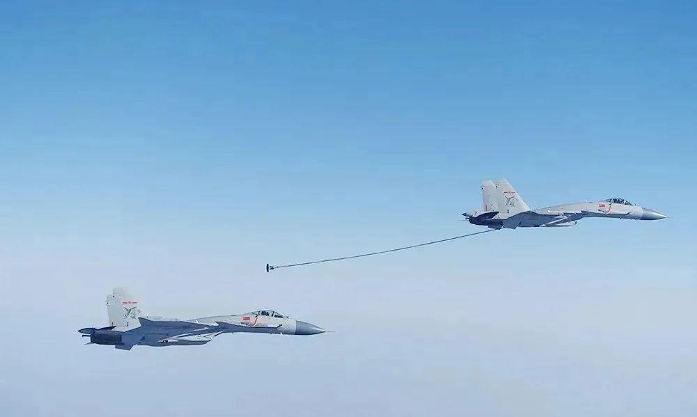 2021年,多批次歼-15舰载战斗机开展跨昼夜多课目编组对抗训练。战机空中 " 穿针引线 ",实施 " 伙伴加油 "。