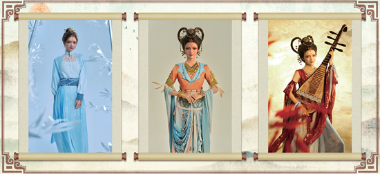 郑屹呈介绍,天妤的发型设计是“双环望仙髻”,簪花是用金、银、铜等金属材料制成多种样式的金钿;头上戴的嵌松石花钗、珍珠流苏花钿等饰品,是在史料基础上,参考唐代出土文物设计而成;妆容上使用的黛眉、斜红、莲花形花钿、桃花妆容,则是还原了新疆吐鲁番阿斯塔那墓出土的唐代女俑妆容……
