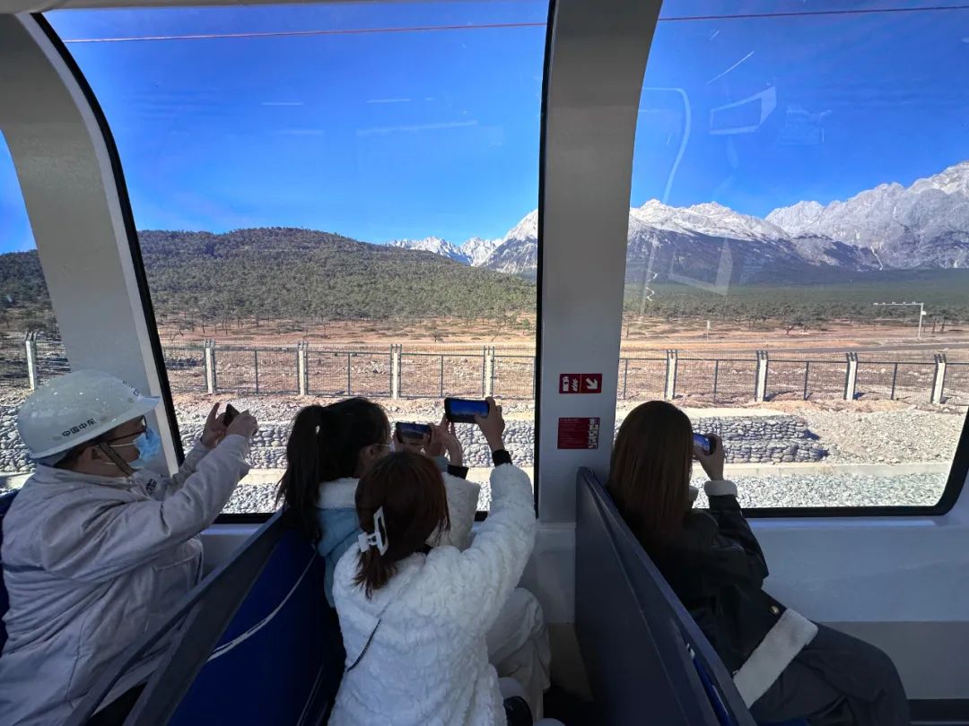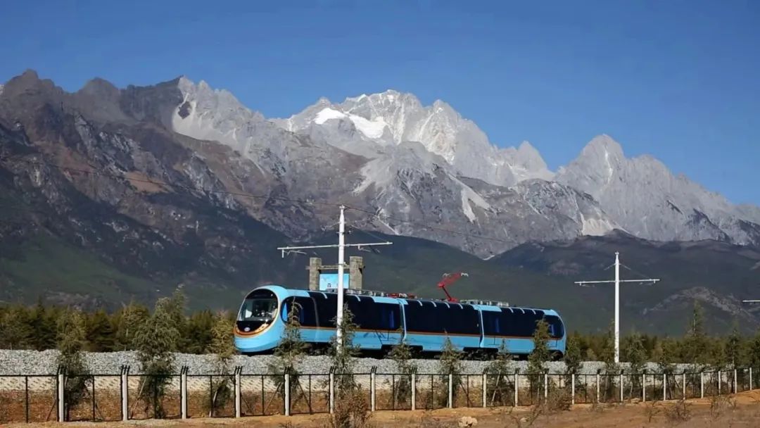 记者在现场看到,整个列车以蓝色为主,前窗采用曲面前窗设计。车窗采用可调变色玻璃设计,可根据日照强度自动调节侧窗颜色,抵挡高海拔地区强紫外线,达到最优的观光效果。在列车内部,客室内饰采用丽江东巴文与纳西族艺术元素的装饰风格,充分展现丽江自然与民族风情。连接古城与雪山,满足不同游客差异化、个性化乘坐需求的丽江观光火车一期工程(丽江轨道交通一号线),由中国铁建、中国中铁、广州地铁共同投资建设,是2020年、2021年云南省“四个一百”重点工程之一,是连接世界文化遗产丽江古城与玉龙雪山5A级景区的旅游观光专线,对提升丽江城市基础设施水平和文化旅游品质具有十分重要的意义。项目总投资30.7亿元,起点为丽江游客集散中心,终点为玉龙雪山甘海子,全线长20.47公里,设置游客中心站、白沙古镇站、玉水寨站、东巴谷站、玉龙雪山站共5个站和1座车辆基地。计划将投入列车16列,有一等座(商务车厢)、二等座两种车型,列车能够满足不同游客差异化、个性化乘坐需求。