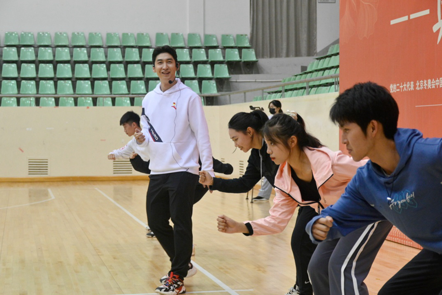武大靖认真传授“起跑美学”动作。严晨晖摄