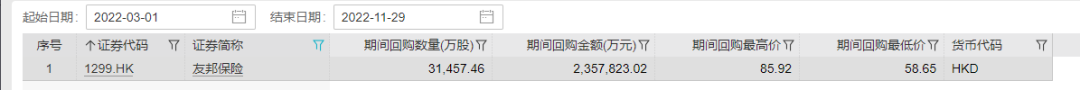 11月28日晚,友邦保险在港交所公告,公司于11月28日,通过集中竞价交易回购314万股,回购金额2.25亿港元。