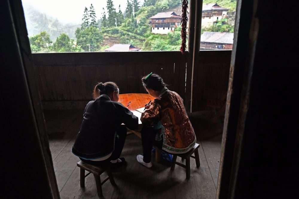 在乌英苗寨“双语双向”培训班课堂上,梁足英(前右)和母亲梁英迷在一起学习(2020年6月8日摄)。