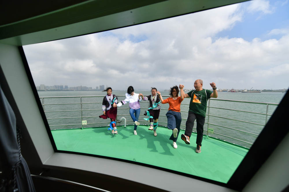 在广东廉江市近海海域的游船上,梁足英(左三)、吴妹富(左一)和游客一起跳舞(2021年11月4日摄)。