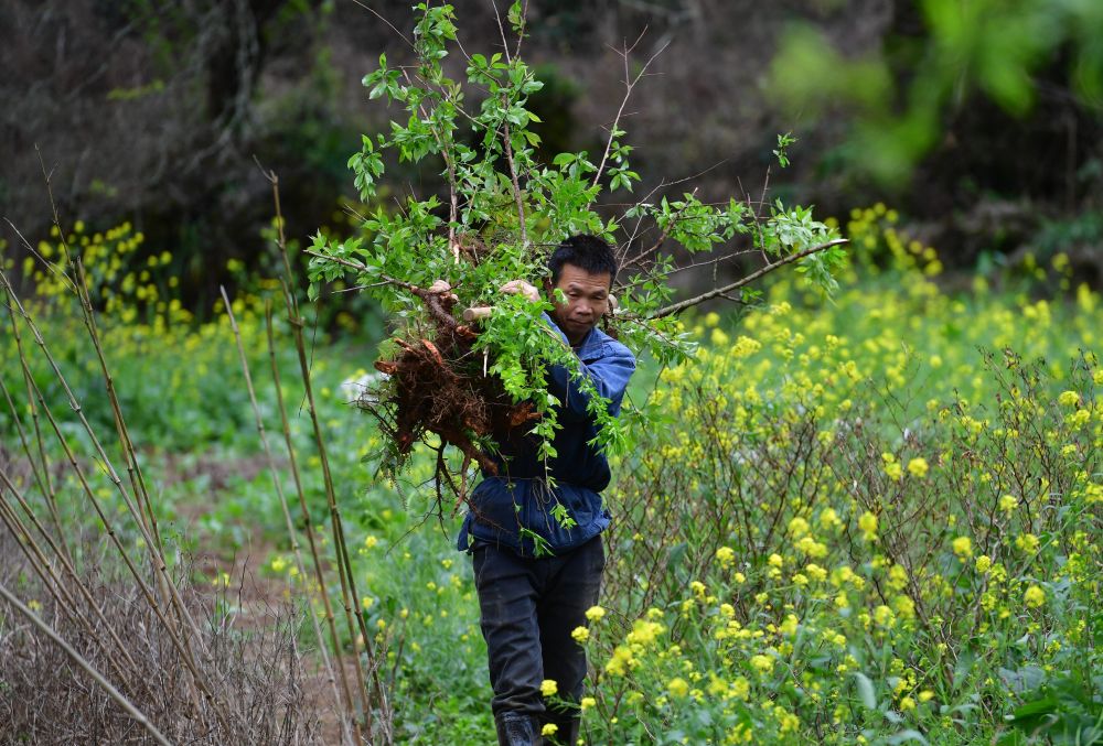 在铜板屯,村民龙革雄扛着树苗上山种植李树(2021年3月7日摄)。