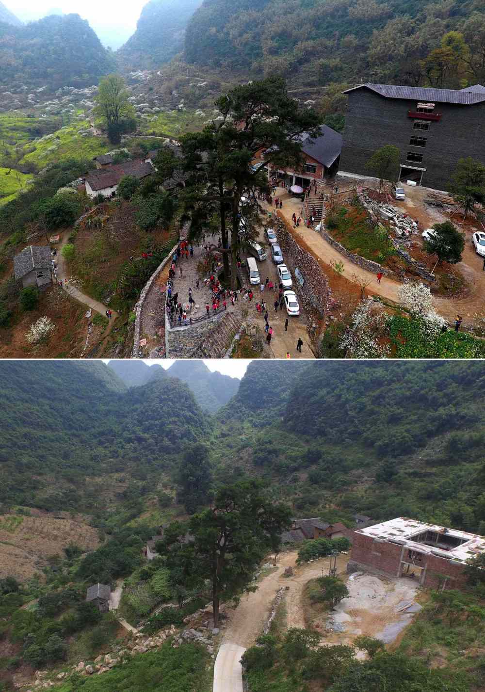 拼版照片:上图为铜板屯的农家食堂、游客接待中心、观景台已经建成(2017年3月2日摄);下图为2015年7月22日拍摄的铜板屯。