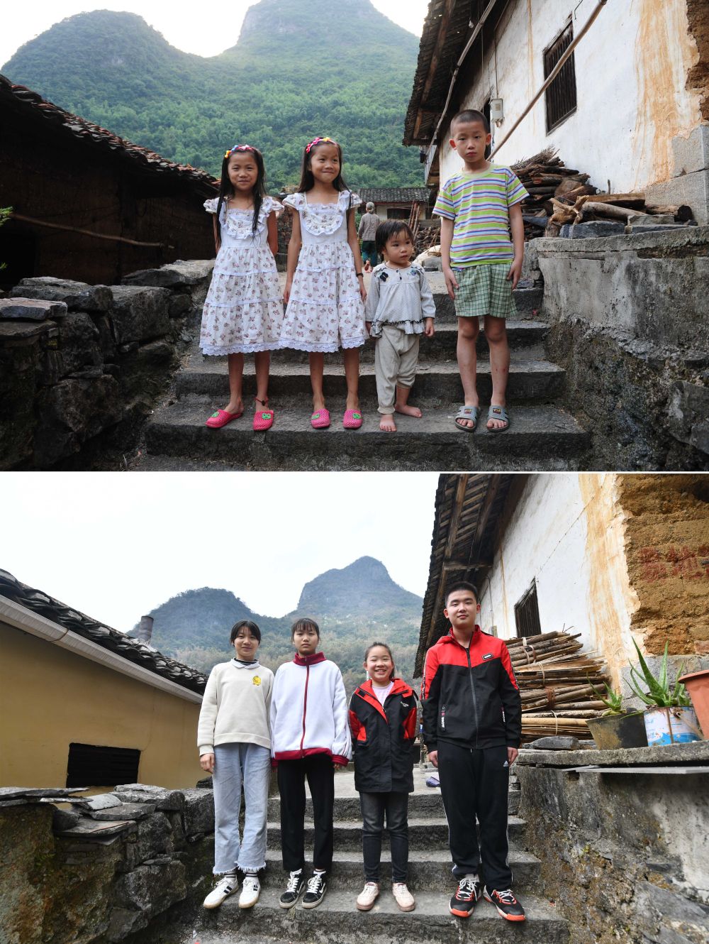 这张拼版照片显示的是龙璐婷、龙璐莹、龙紫贤、龙杰(从左至右)在铜板屯的合影(上图摄于2013年7月23日,下图摄于2021年2月15日)。
