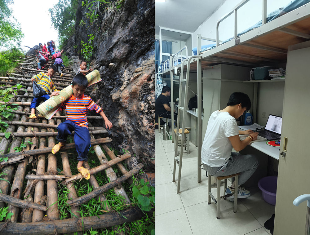 拼版照片:左图为在弄勇村弄顶屯,弄勇小学四年级学生蒙宣任(前)背着生活用具,爬“天梯”去上学(2012年9月3日摄);右图为在辽宁省交通高等专科学校,大一学生蒙宣任在宿舍里上网课(潘建成2022年5月28日摄)。