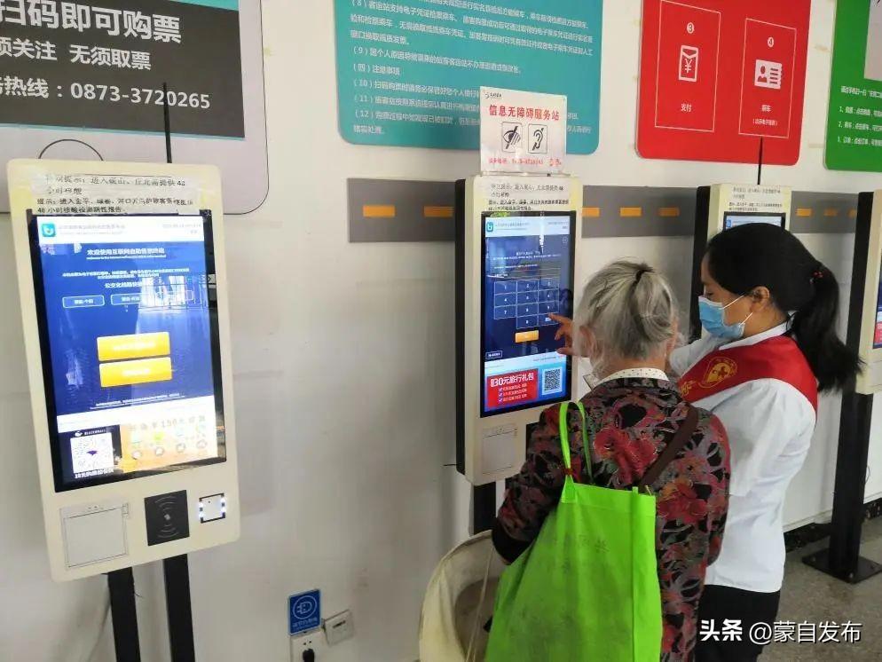 在蒙自汽车客运站的信息无障碍服务台,设置了两台无障碍信息服务设施,志愿者们会帮助老年旅客在自助购票机上购买车票,用实际行动助力老年人跨越“数字鸿沟”,营造良好社会氛围。