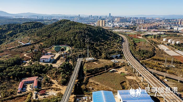 青龙山隧道位于云南省昆明市呈贡区,全长629米,为单洞双线隧道,是渝昆高铁进入昆明市区的“咽喉”隧道,全隧为Ⅴ级围岩,最大埋深仅84米,设计时速350公里每小时,隧道结构与沪昆高铁、南昆客专平行,直线距离沪昆高铁60米左右。