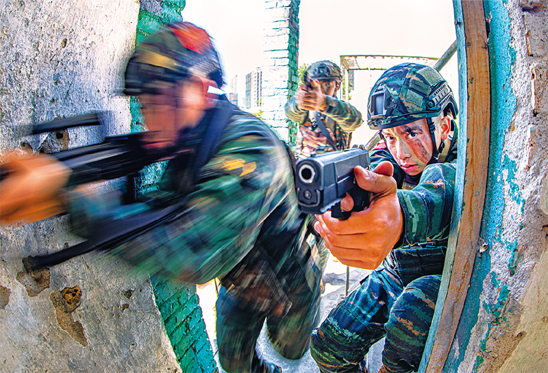 图为2022年10月27日,武警广西总队北海支队学习贯彻党的二十大精神,掀起练兵备战热潮,组织特战队员开展综合演练。 新华社发 梁承杰/摄