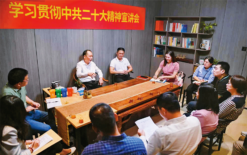 党的二十大报告强调坚持贯彻新时代党解决台湾问题的总体方略,为做好新时代对台工作提供了根本遵循和行动指南。图为2022年11月16日台盟福建省委会的宣讲员在向盟员宣讲中共二十大精神。 王鸿燕/摄