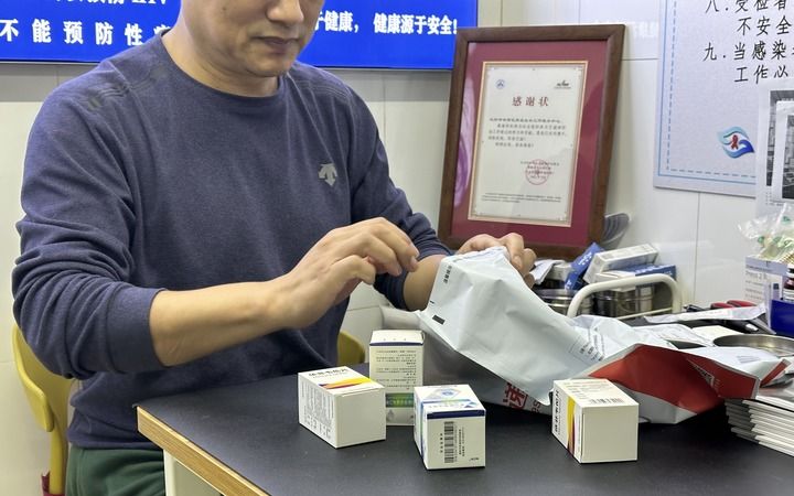 沈阳益康社工负责人皓仁在整理艾滋病防治药物,新华社记者 李昂 摄