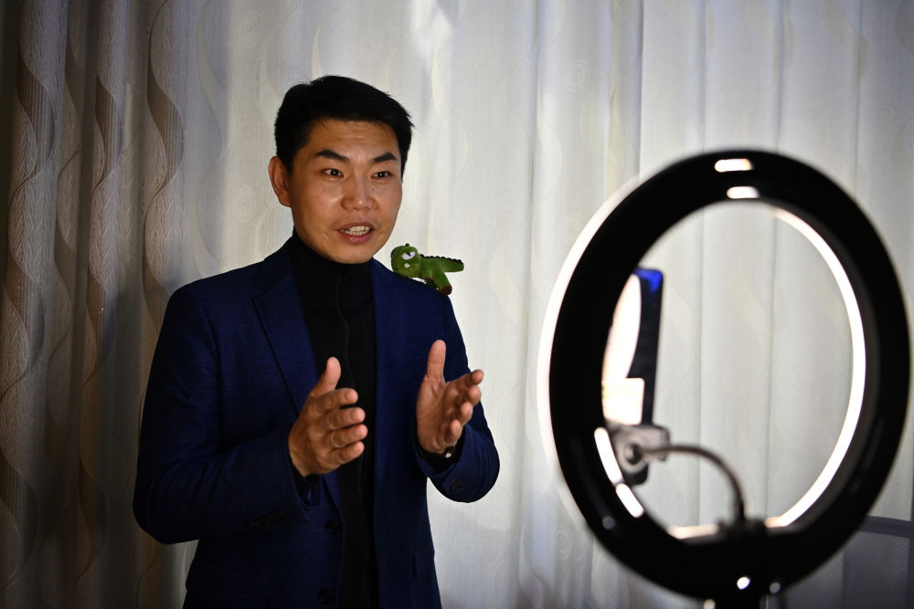 11月30日,太原市交通学校老师韩锐在家里录制心理学科普小视频。新华社记者 杨晨光 摄