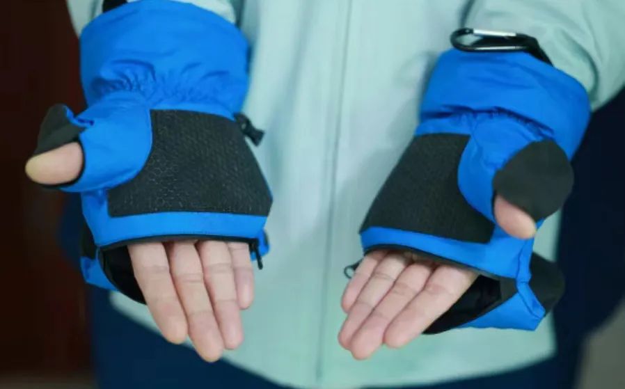 2、当需要完成手部操作时,可通过将拉开掌指关节和拇指关节处拉链,将指端手套部分向后折叠,通过魔术贴固定于手背处,从而使手指全部暴露进行精细化操作动作,也可随时将手指回缩至手套内取暖;