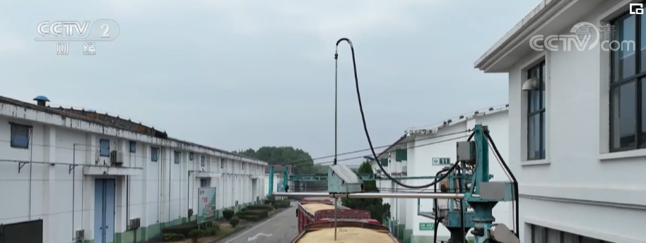 在中央储备粮江西泰和直属库门口,我们看到运粮车送来的稻谷通过检测、过磅称重后,直接通过运输带运送到粮仓里,中途不需要人工搬运,确保运输环节无损耗,不浪费粮食。