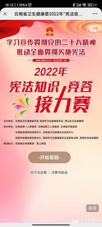 启动仪式上,首次公开发布了云南省卫生健康委员会法治工作十年宣传片《法治的力量》,宣传片讲述了十年来全省卫生健康系统在委党组的正确领导下,不断提高运用法治思维和法治方式解决问题的能力和水平,卫生健康法治工作取得的明显成效。云南省卫健委2022年“宪法宣传周”系列活动“2022年宪法知识竞答接力赛”也已于12月2日启动,可通过扫描二维码参与答题并获得抽奖机会。市民扫码参与答题随机选取10题,成功答对8题即可参与抽奖赢取精美纪念品,答题内容围绕学习宣传党的二十大精神、学习宣传习近平法治思想、学习宣传宪法、学习宣传现行宪法公布施行四十年的深远历史意义。动动手指即可参与其中,了解宪法知识的同时还能领取“学法大礼包”。