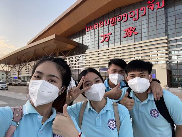 刘银能(右二)和同事在万象站前合影。受访者供图