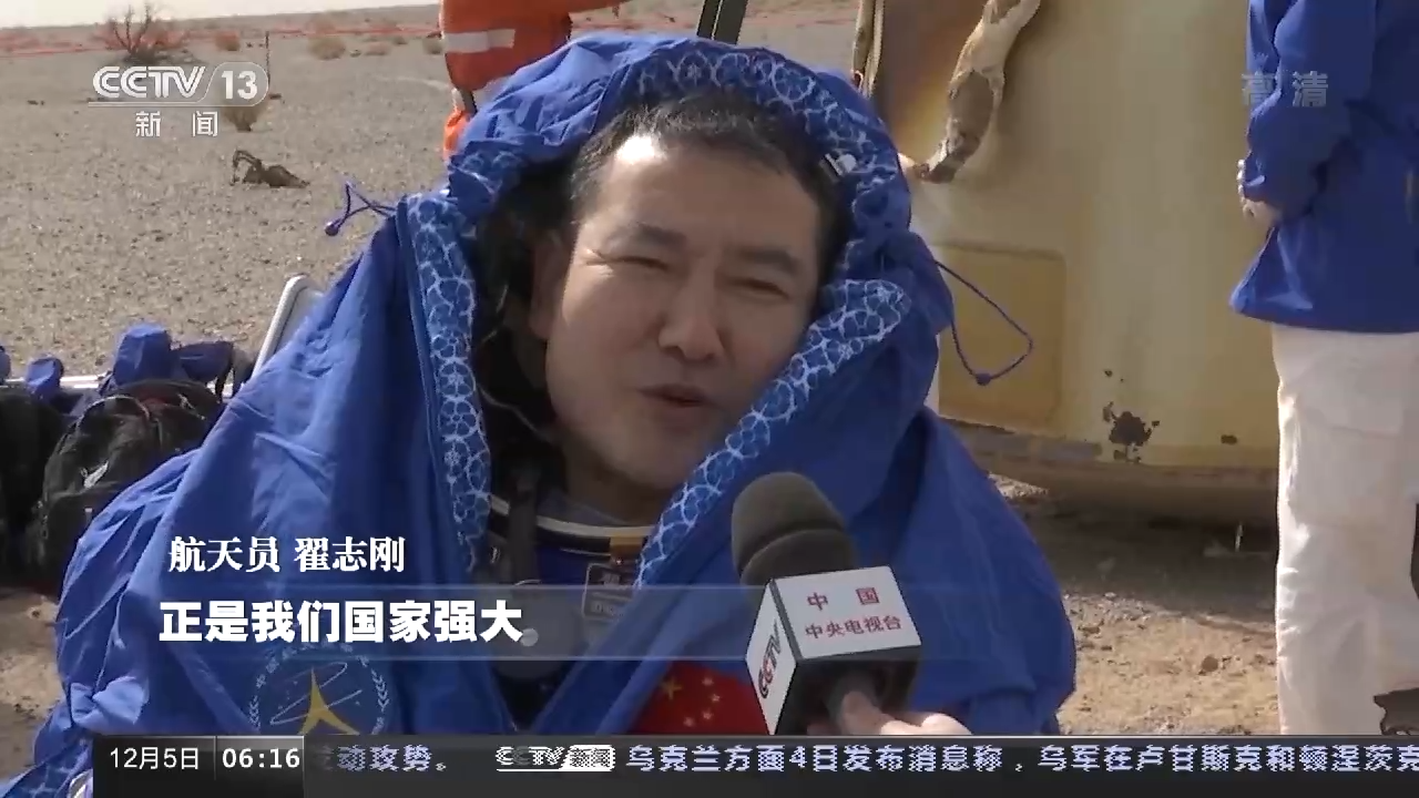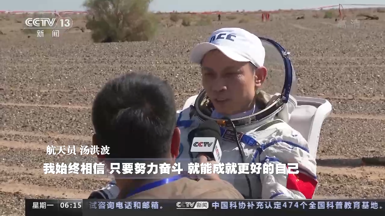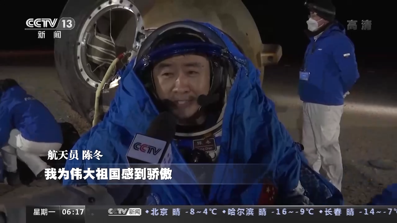 航天员 陈冬:六个月忙碌而又充实的太空之旅,很有幸见证了中国空间站基本构型建成。我们像流星一样回到祖国的怀抱,我为伟大祖国感到骄傲。
