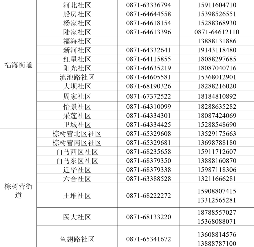 社区 | 拓东街道 | 明通巷 社区 | 0871-63187832 | 13618718537 | 08:00 -20:00 |
