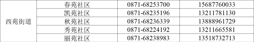 东华街道 | 田园路社区 | 0871-67163631 | 18082984867 | 08:00 -20:00 | |