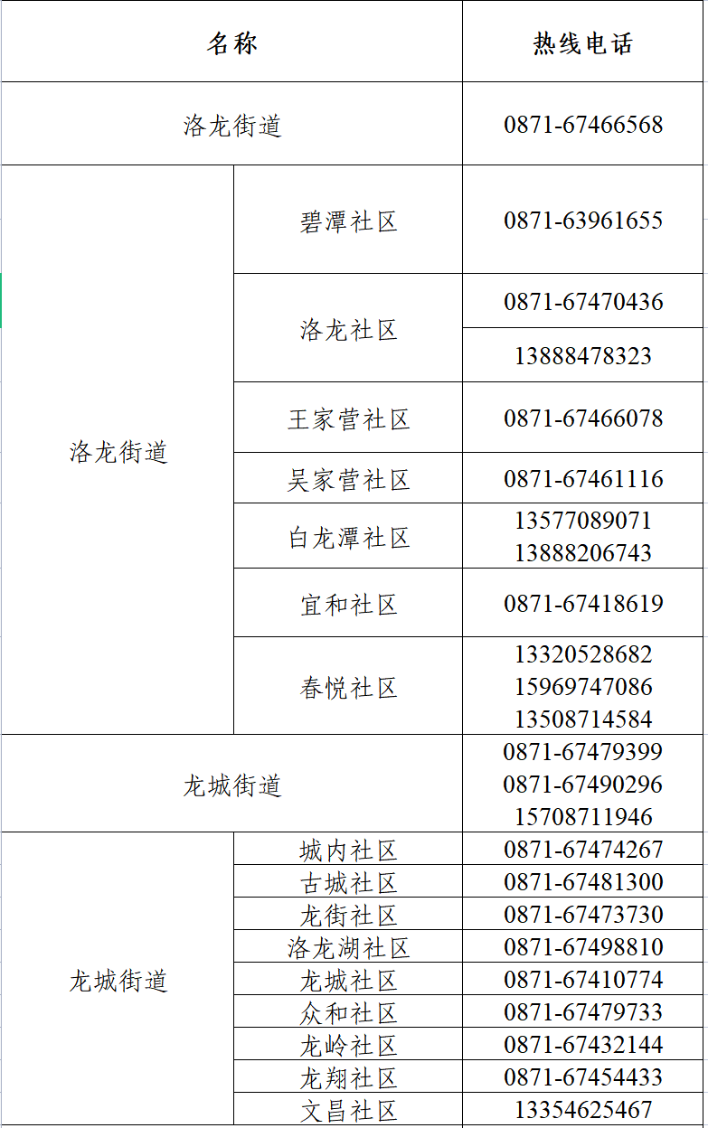 双龙街道 | 麦冲 社区 | 0871-65656939 | 13888616466 | 08:00 -20:00 | |