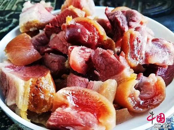猪膘肉又称“琵琶肉”,是云南怒江、丽江和迪庆地区普米族、纳西等族的传统肉制品,一般腌制一年才食用,时间越久,猪膘肉质量越上乘,以丽江泸沽湖摩梭人制作的琵琶肉最具代表。在摩梭人习俗中,猪膘肉是财富象征,即家里腌制的猪膘肉数量越多、肥肉越肥,当地人就认为这家人很富有,从而彰显其财富和地位。猪膘肉也是摩梭人逢年过节以及招待珍贵客人的上等佳肴,更是摩梭人告别童年的成人礼上必有的传统美食。
