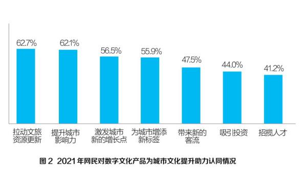基于大数据和网络问卷调查,我们选取数字文博、电影、电视剧、综艺、电竞、游戏、音乐等具有一定产业实践和群众基础的数字文化产品数据进行分析,结果显示当城市文化和数字文化产品相结合时,六成以上用户认为将拉动城市文旅资源更新和提升城市影响力,56.5%的用户认为还将激发城市新的增长点,55.9%的用户认为可为城市增添新标签(见图2)。数字文化产品正在助力城市精神文明建设、城市人文发展、城市形象传播工作效果提升。