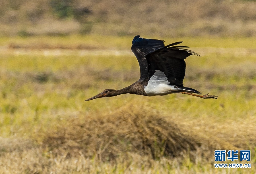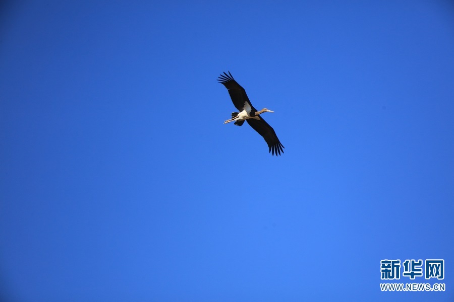 飞翔的黑鹳(11月27日摄)。新华网发 (杨磊 摄)
