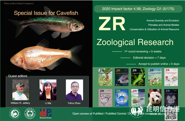 由中国科学院昆明动物所创刊并发行的SCI期刊《动物学研究》(Zoological Research)还专门策划了洞穴鱼类特刊(Special Issue for Cavefish),该特刊由美国马里兰大学William R. Jeffery教授、中国科学院昆明动物研究所马莉研究员和中国科学院动物研究所赵亚辉副研究员担任客座编辑,向国际国内征集以洞穴鱼类物种为研究主题的原创研究或综述文章,目前已经收到来自中国,英国,美国,法国,墨西哥,瑞士等多篇投稿。