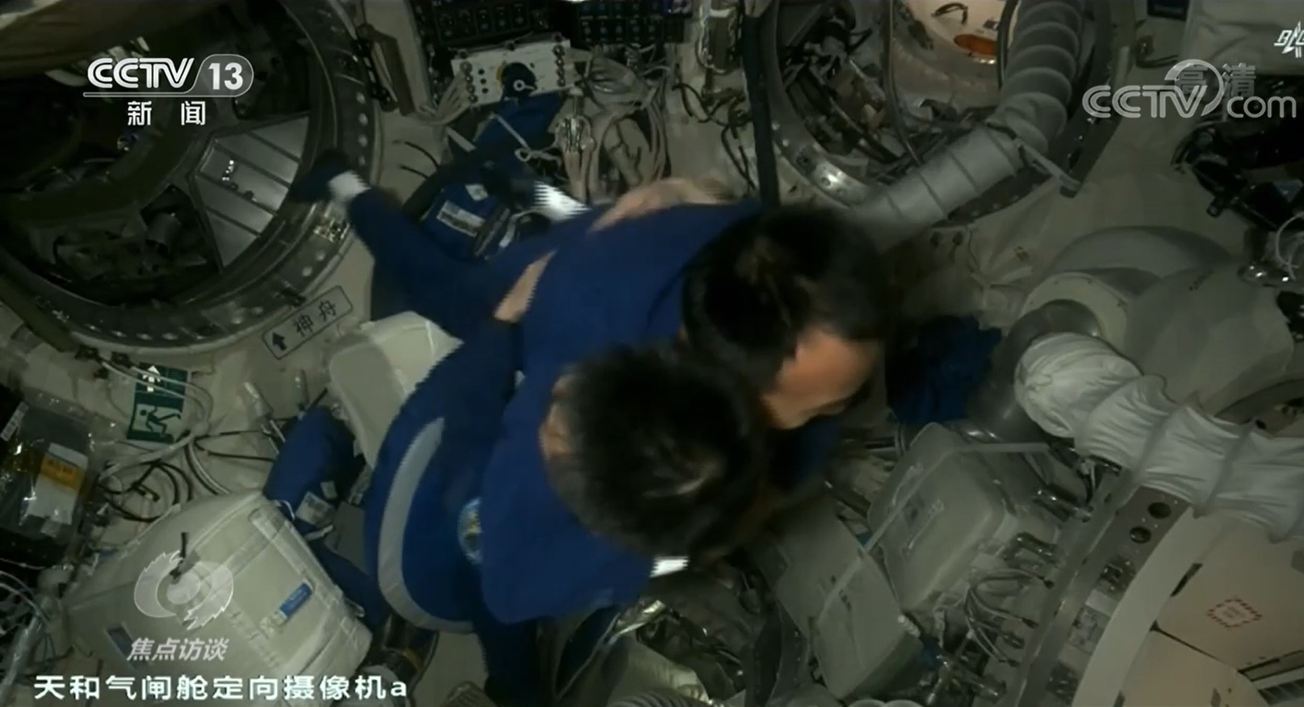 拥抱,紧紧的拥抱,在离地面约400公里的太空轨道,中国第一个在太空翻跟头的航天员费俊龙时隔17年后再上太空,热情地跟迎接他的蔡旭哲拥抱在一起,差点又翻了一个跟头。问天实验舱里洋溢着欢乐的气氛。
