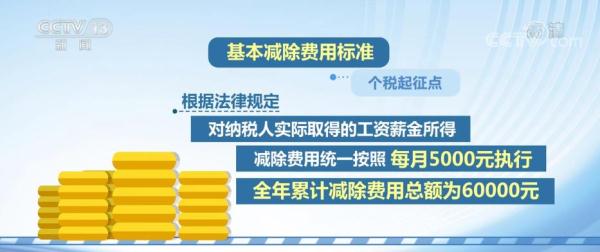 首先是基本减除费用标准,也就是个税起征点。根据法律规定,对纳税人实际取得的工资薪金所得,减除费用统一按照每月5000元执行,全年累计减除费用总额为60000元。