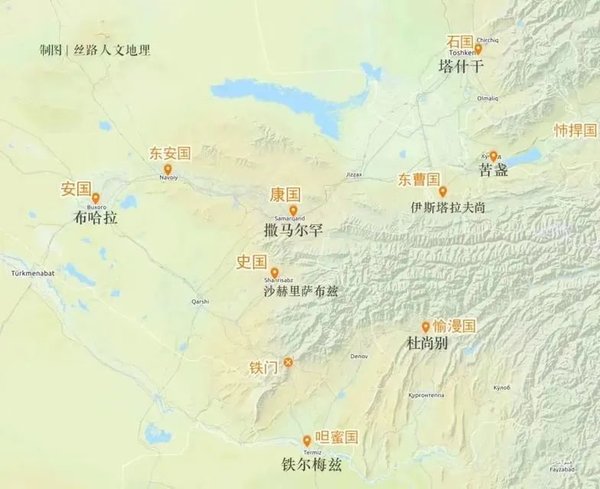 胡旋舞起源于中亚的康国,大致位于今天乌兹别克斯坦的撒马尔罕一带,是粟特人建立的国家之一。粟特人是中世纪生活在中亚河中地区的一个民族,他们曾建立多个城邦国家。除宗主国康国外、还有安国、米国、史国、石国、何国、曹国、火寻、戊地八国,这些国家的人在中国史书上被称为“昭武九姓”。