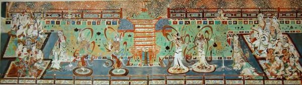 敦煌莫高窟220窟盛唐时期所绘的大幅经变画中,既有动作相对缓慢的双人舞(可看作是胡旋的起始形象),又有特征明显的急速胡旋图。其北壁《药师经变图》下端绘有场面辉煌的胡旋舞图。舞伎分为文、武两组,都足踏小圆花毯翩翩起舞。这对舞伎披着发辫,相向而舞。两臂平举,双足着毯,从舞巾的抛洒飞动之势,可以感受到她们旋转的速度,不禁让我们想起了元稹、白居易等诗人对胡旋女舞姿的描摹,也印证了《新唐书·音乐志》中“胡旋舞,舞者立毬(毯)上,旋转如风”的记载。