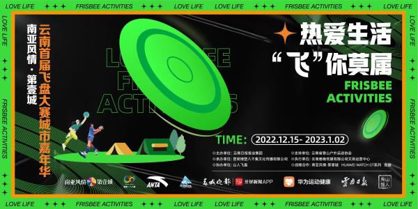 南亚风情·第壹城“云南首届飞盘大赛城市嘉华”由云南日报报业集团主办,云南省登山协会支持,昆明博塑八千集文化传播有限公司承办,山人飞盘协办,赛事全程由云南春晚传媒有限公司文体运营中心执行。同时安踏和华为运动健康将作为赛事独家品牌战略合作为比赛保驾护航。嘉年华将通过社交精致露营微度假、趣玩亲子互动体验、各行业及网红专场等形式带来兼具观赏性及互动性的体验,在2022年12月至2023年元旦假期的每个周末都有精彩活动,向昆明人散发飞盘运动的魅力。
