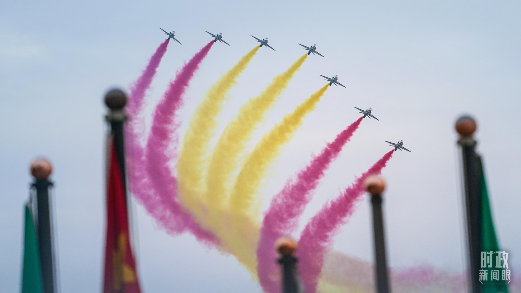 △沙特礼宾护卫机在空中拉出象征中国国旗的红黄两色彩带。(总台国广记者李晋拍摄)