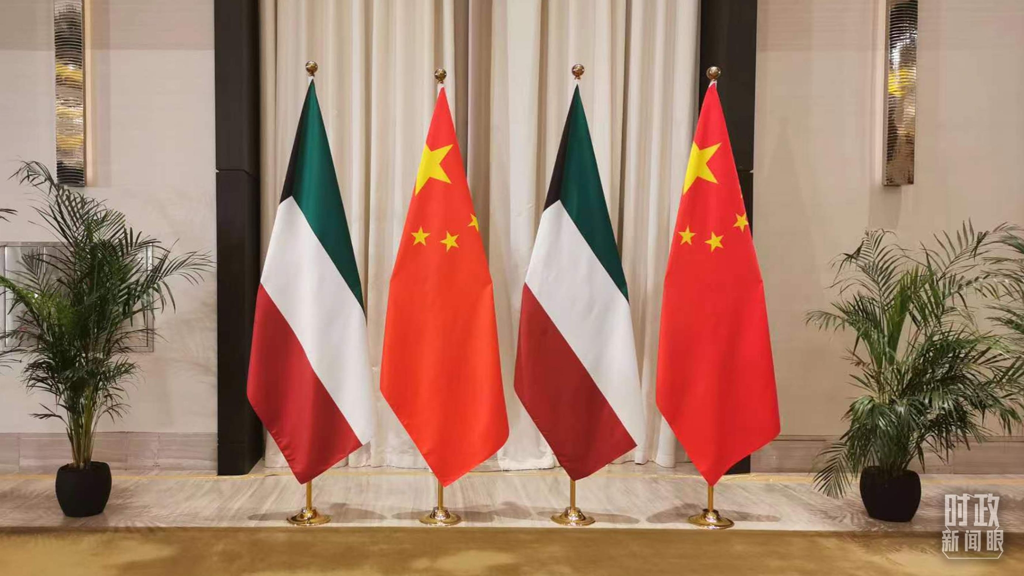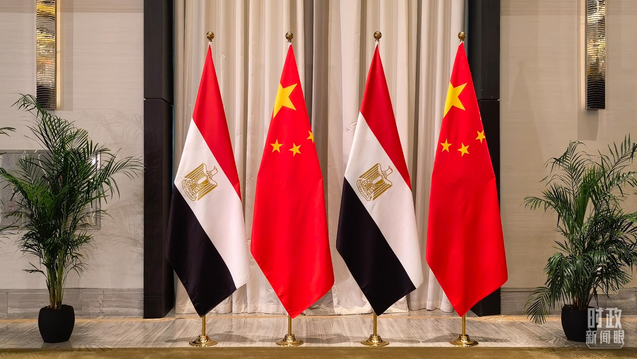 △会见现场的中埃两国国旗。(总台央视记者韩锐拍摄)