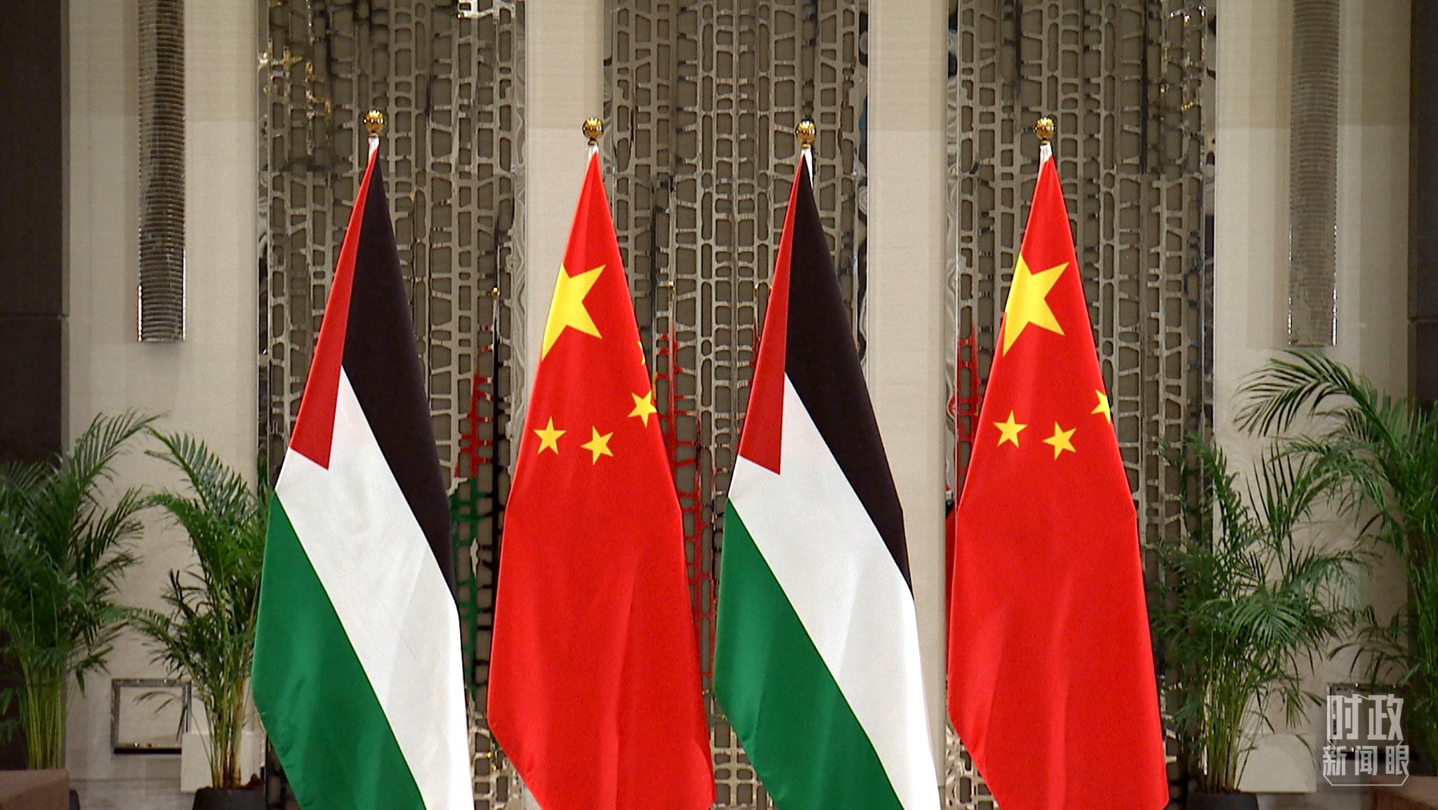 △会见现场的中巴两国国旗。(总台央视记者张宇拍摄)
