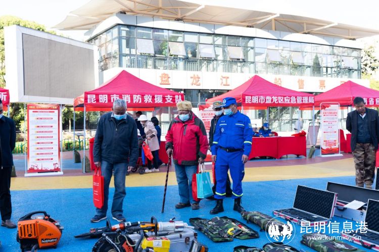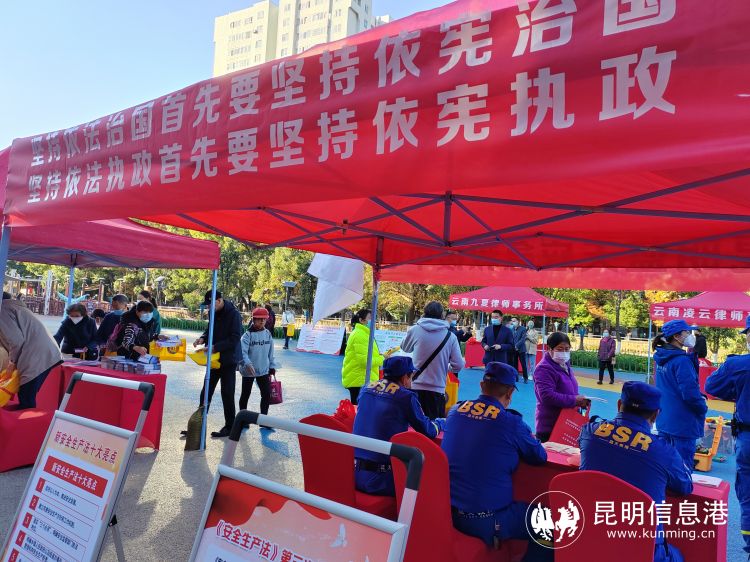 活动现场,LED 屏不间断播放《宪法》《党的二十大精神》,习近平总书记关于依法治国、安全生产的重要讲话等宣传教育片、参加活动单位提供的宣传片及警示教育片等内容;现场还在主题宣教区设置了10多块展板,重点宣传《宪法》《安全生产法》《法律援助法》《民法典》《昆明市安全生产条例》《云南省生产经营单位安全生产主体责任规定》等法律法规、应急救援知识、消防安全知识和防灾减灾常识等;在应急装备展示区,由昆明市消防救援支队、蓝天救援队在展示区组织开展应急救援装备展示、并对装备进行讲解;由云南省应急管理厅、昆明市应急管理局、昆明市安全生产协会、市消防救援支队、蓝天救援队、盘龙区应急管理局、昆明市安全生产协会、建纬(昆明)律师事务所、云南九夏律师事务所、云南凌云律师事务所、盘龙区鼓楼街道办事处等十多家单位在现场设立了咨询区,并向现场观众发放了扇子、纸巾、钥匙扣、布袋、 陶瓷杯、法典手册等上千份宣传资料。
