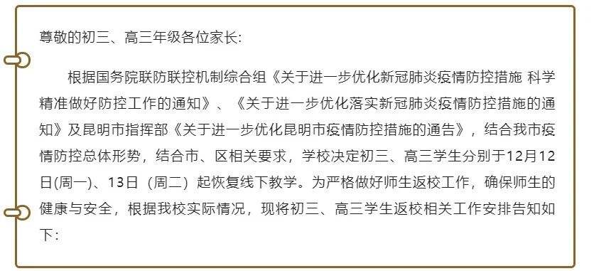 12月11日,昆十中、白塔中学发布《关于初三、高三年级返校恢复线下教学致家长书》,明确初三、高三学生分别于12月12日、13日起恢复线下教学。