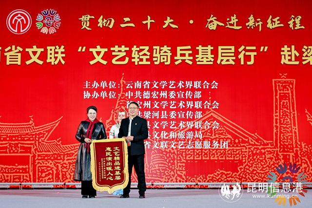 演出现场,云南省文联文艺志愿服务团向梁河县赠送了书法作品。干部群众们纷纷表示,省文联文艺志愿服务团精彩的文艺慰问演出,有效推动了党的二十大精神在梁河落地生根,同时在疫情防控政策调整,经济社会发展复苏的关键时刻,传递了温暖、凝聚了人心、鼓舞了士气、激发了斗志。